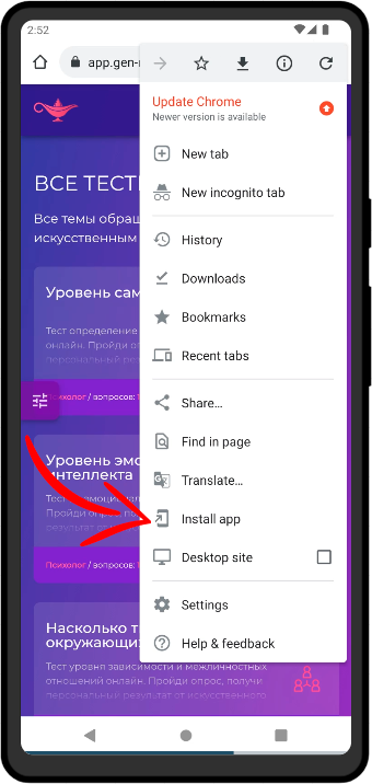 - выберите Добавить на гл. экран («Install app») и следуйте инструкции