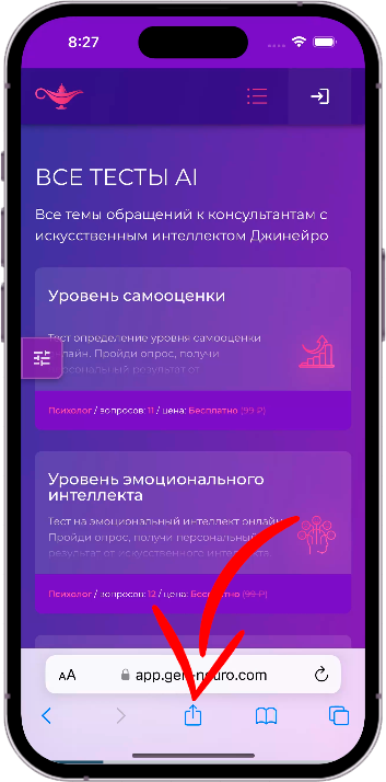 - войдите в Gen-aura в Safari и нажмите «Поделиться» в нижней части экрана