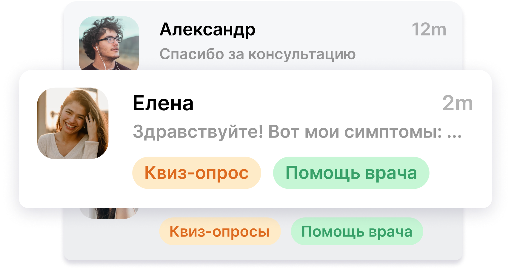 Выбирайте специалиста и общайтесь с его AI-ассистентом 24/7: задавайте вопросы, уточняйте симптомы, получайте подготовительные рекомендации